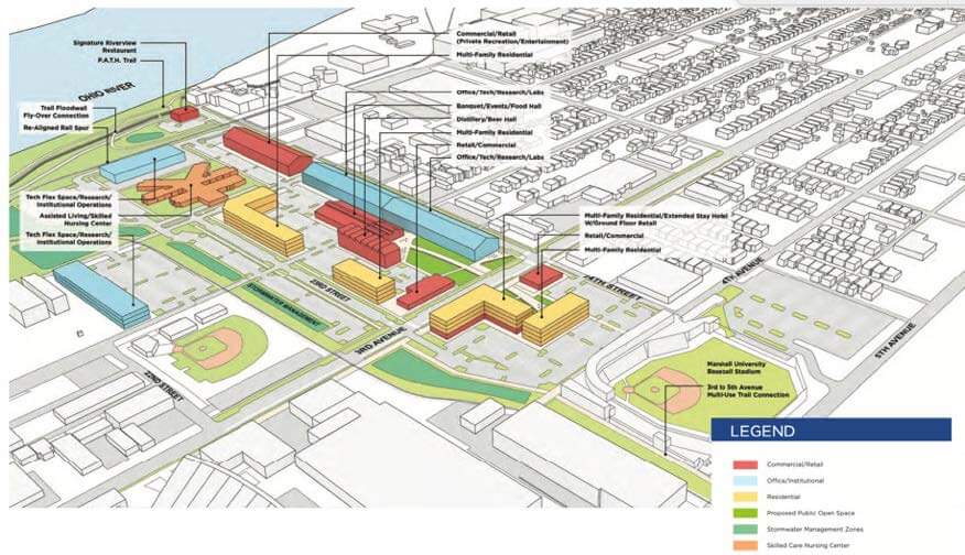 - A redevelopment of the property to include a baseball stadium, academic facilities, faculty housing, research and advanced manufacturing facilities working symbiotically with Marshall University all in a walkable park/campus setting with connections to the Paul Ambrose Trail for Health (PATH)